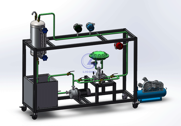 整套裝置由鋼制安裝框架、水箱、鍋爐、循環(huán)水泵、調節(jié)閥、空氣壓縮機、儀表、就地計算機操作臺、就地智能儀表控制上位監(jiān)控軟件、外置配套設備等組成,工藝路線簡潔清晰,現(xiàn)場儀表與通訊模塊有機結合,上位計算機控制,設置DCS界面及自動評分系統(tǒng)。