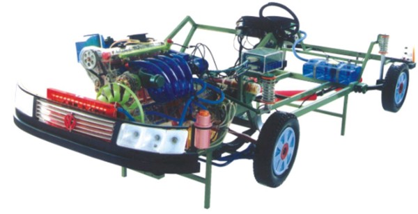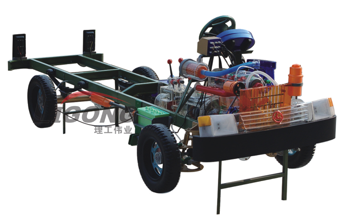 本品選用透明有機(jī)玻璃制作,內(nèi)中部件均以硬質(zhì)塑料料加工,用 螺絲固定在金屬高溫烘漆而成的車架上。各總成部分都以壓模成形加 工,代替過去膠粘合的方法,使產(chǎn)品在強(qiáng)度上有很大提高。發(fā)動(dòng)機(jī)總成用電機(jī)驅(qū)動(dòng),在油門處設(shè)有調(diào)速裝置,能演示發(fā)動(dòng)機(jī)轉(zhuǎn)速高低。離合器分離明顯,操縱靈活,離合器外殼整體壓模而成,變速箱和各檔齒輪用各種顏色表示,換檔靈活,手制動(dòng)美觀。后橋外形壓模而成,內(nèi)中主減速、差速轉(zhuǎn)動(dòng)自如,輪轂剎蹄壓模成型,剎蹄可調(diào)節(jié),前橋輪鼓可調(diào)整,轉(zhuǎn)向裝置以及電瓶、油箱、水箱,制動(dòng)管路分布清楚一目了然。電路采用對插件前后分布,燈架、風(fēng)窗、儀表板、后燈架用透明有機(jī)玻璃壓模成整體美觀逼真。