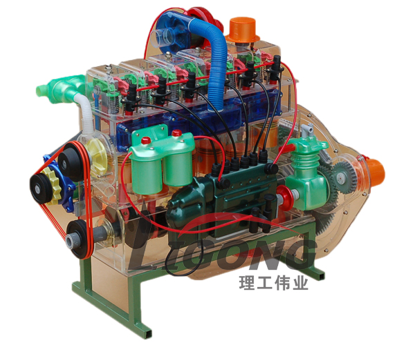 透明發(fā)動機模型外殼選用透明有機玻璃制作,內(nèi)部部件均以硬質塑料料加工,用螺絲固定在金屬高溫烘漆而成的鐵架子上??偝刹糠侄家詨耗3尚渭庸?,代替過去膠粘合的方法,使產(chǎn)品在強度上有很大提高。發(fā)動機總成模型用直流電機驅動,能演示發(fā)動機內(nèi)部曲軸、活塞、氣門等運行情況,點火系統(tǒng)采用燈光演示,能根據(jù)實際發(fā)動機運行時的點火順序進行演示。