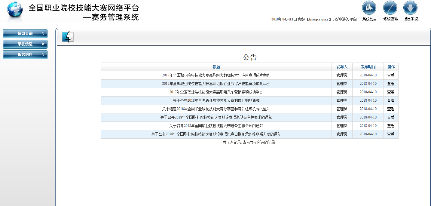 在登錄界面輸入正確的用戶名和密碼后(學(xué)校用戶密碼由省市統(tǒng)一下發(fā) ),即可登錄大賽賽務(wù)管理系統(tǒng),首界面如下圖3-1-2:
