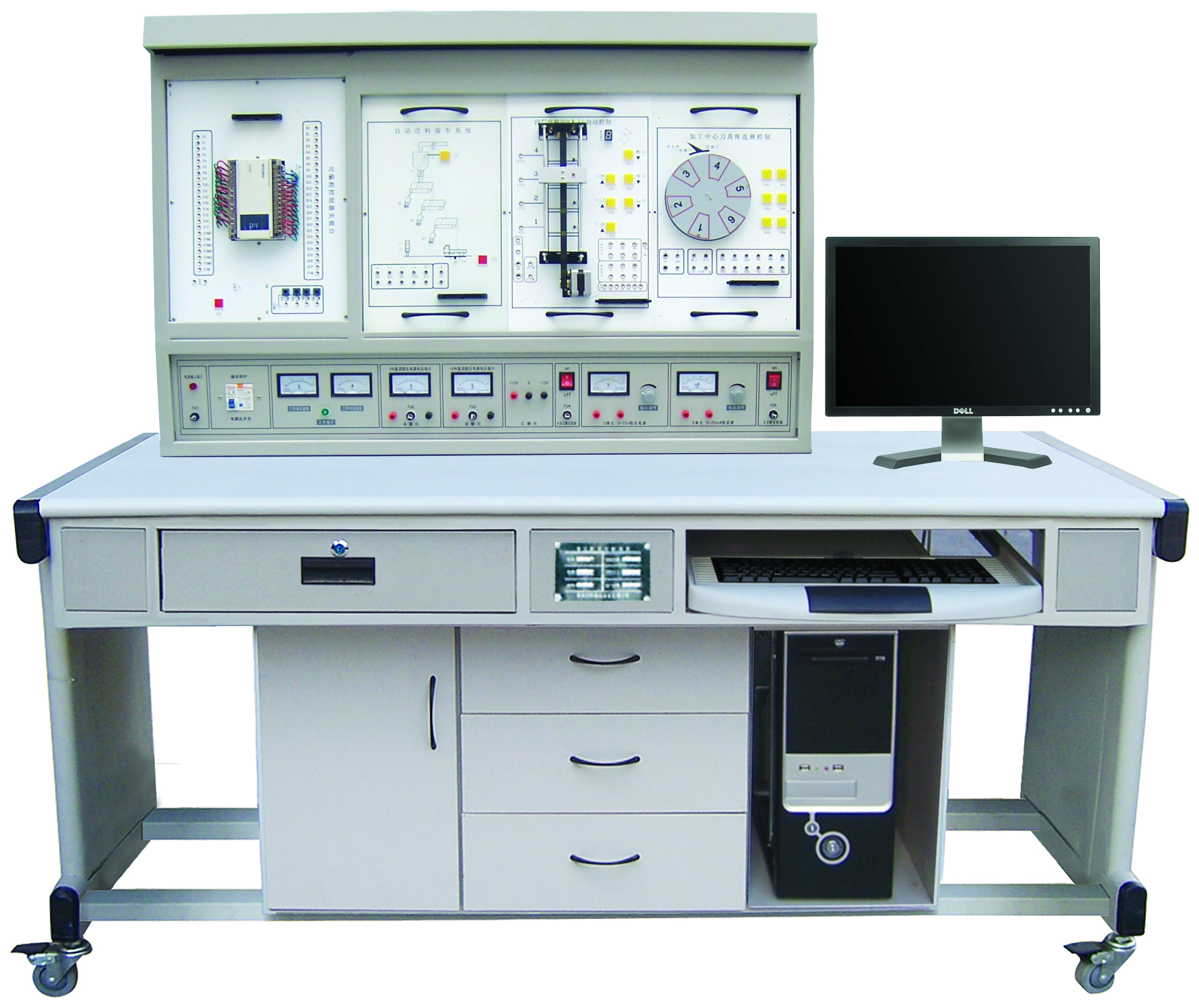 PLC綜合實訓裝置采用鈑金加鋁合金架構,桌體設備為鐵質(zhì)雙層亞光密紋噴塑結構,電源屏面板采用鋁質(zhì)面板凹字爛板工藝,主要有由控制屏、實訓桌、電腦、主機實訓組件、實訓單元(含豐富的工業(yè)現(xiàn)場設備實訓對象)、觸摸屏掛箱、電機、電機導軌、測速機構等組成。實訓臺上部為鋁型材框架結構,下層部分配有采用凹字爛板工藝鋁質(zhì)長條面板。上部為框架式掛箱放置區(qū),可以掛接實訓掛件。整個裝置美觀大方。