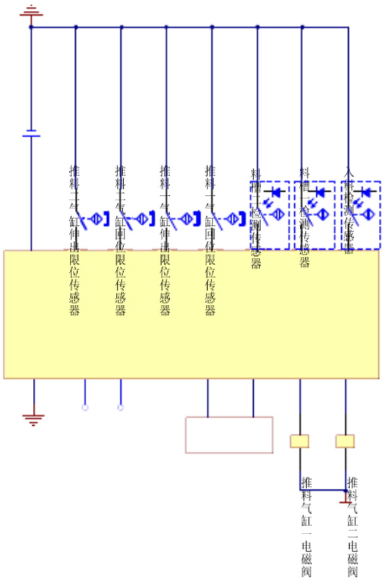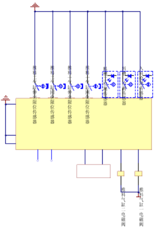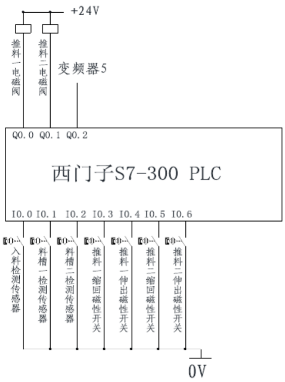 系統(tǒng)啟動,將物料放到光電傳感器前的皮帶上,當光電傳感器檢測到有工件進入,即給控制系統(tǒng)發(fā)出信號,控制系統(tǒng)給變頻器發(fā)出啟動信號。變頻器驅(qū)動三相交流電機帶動皮帶轉(zhuǎn)動,當物料為金屬時電感傳感器檢測到信號,變頻器停止,推料氣缸一動作,將物料推入第一個料槽;當物料為非金屬時電容傳感器檢測到信號,變頻器停止,推料氣缸二動作,將物料推入第二個料槽。