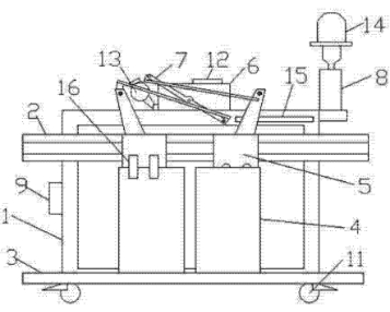如圖1和圖2所示,一種電梯門機實訓裝置,包括架體1,架體1上下分別固定門導軌2和地坎3,兩個轎門4頂部分別通過門刀16和門掛板組件5連接在門導軌2上,轎門4底部卡接在地坎3上,轎門4的門掛板組件5頂部通過連桿機構7與設置在架體1頂部的門機減速裝置6和電機13相連,門機減速裝置6設置門機控制器12,架體1的底架上設置配重塊10,架體1頂部設置照明燈14和手動控制機構8,架體1上設置一個電源9,架體1底部設置萬向輪11,轎門4頂部的架體上安裝有到位開關15。