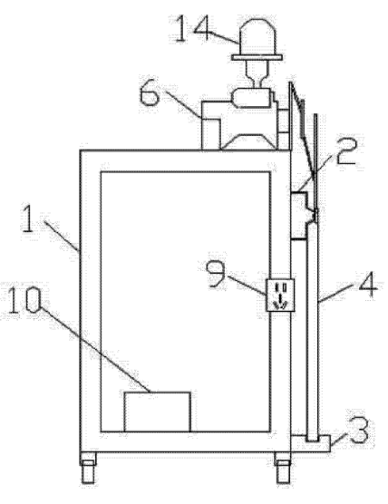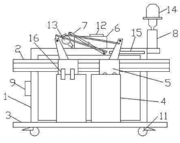 圖中1架體、2門導軌、3地坎、4轎門、5門掛板組件、6門機減速裝置、7連桿機構、8手動控制機構、9電源、10配重塊、11萬向輪、12門機控制器、13電機、14照明燈、15到位