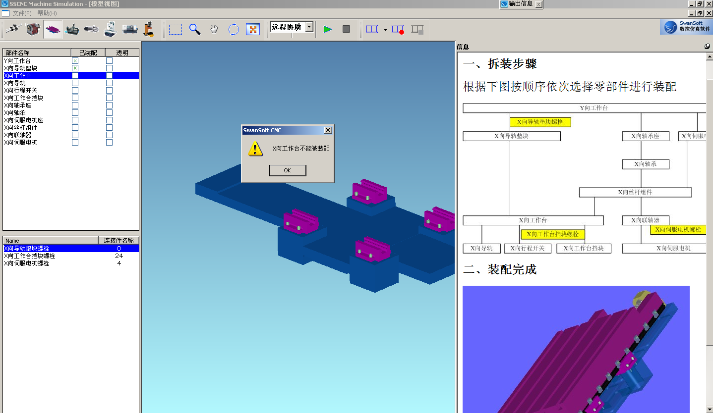 (1) 數(shù)控機床結(jié)構(gòu)包含3D數(shù)控車床和數(shù)控銑床,在結(jié)構(gòu)中能顯示零件名稱、同時可以隱藏或透明零件顯示。軟件具有虛擬互動裝配和拆卸功能,并能自動判斷拆裝操作的正確性。