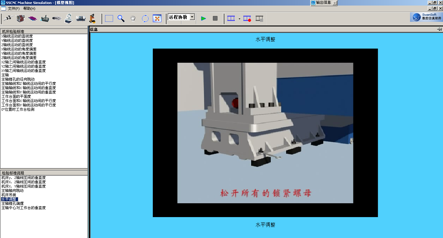 (1) 同時提供裝配的檢驗標準及檢驗流程動畫。包括:X軸直線度檢測、Y軸直線度檢測、Z軸直線度檢測、X軸角度偏差檢測、Y軸角度偏差檢測、Z軸角度偏差檢測、XZ軸垂直度檢測、YZ軸垂直度檢測、XY軸垂直度檢測、主軸錐孔跳動檢測、主軸軸線與Z軸平行度檢測、主軸軸線與X軸垂直度檢測、主軸軸線與Y軸垂直度檢測、工作臺平面度檢測、工作臺和X軸平行度檢測、工作臺與Y軸平行度檢測以及機床吊裝、機床水平調(diào)整、主軸中心對工作臺垂直度調(diào)整等。
