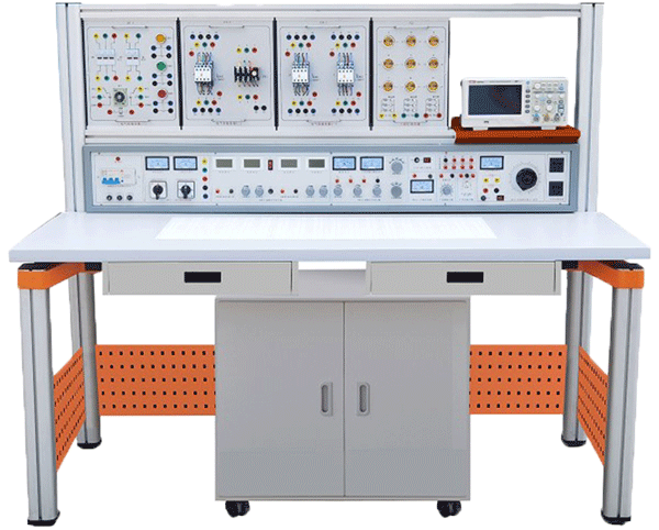裝置由主機箱、實驗桌、實訓(xùn)掛箱、獨立封裝實訓(xùn)電路模塊、移動矮柜、示波器架、學(xué)生凳等組成。實訓(xùn)裝置支架與實訓(xùn)桌可組合、可拆裝。支架與桌腳一體,鋁合金結(jié)構(gòu),實訓(xùn)掛箱、各實驗?zāi)K可根據(jù)實驗需求自由組合放置。