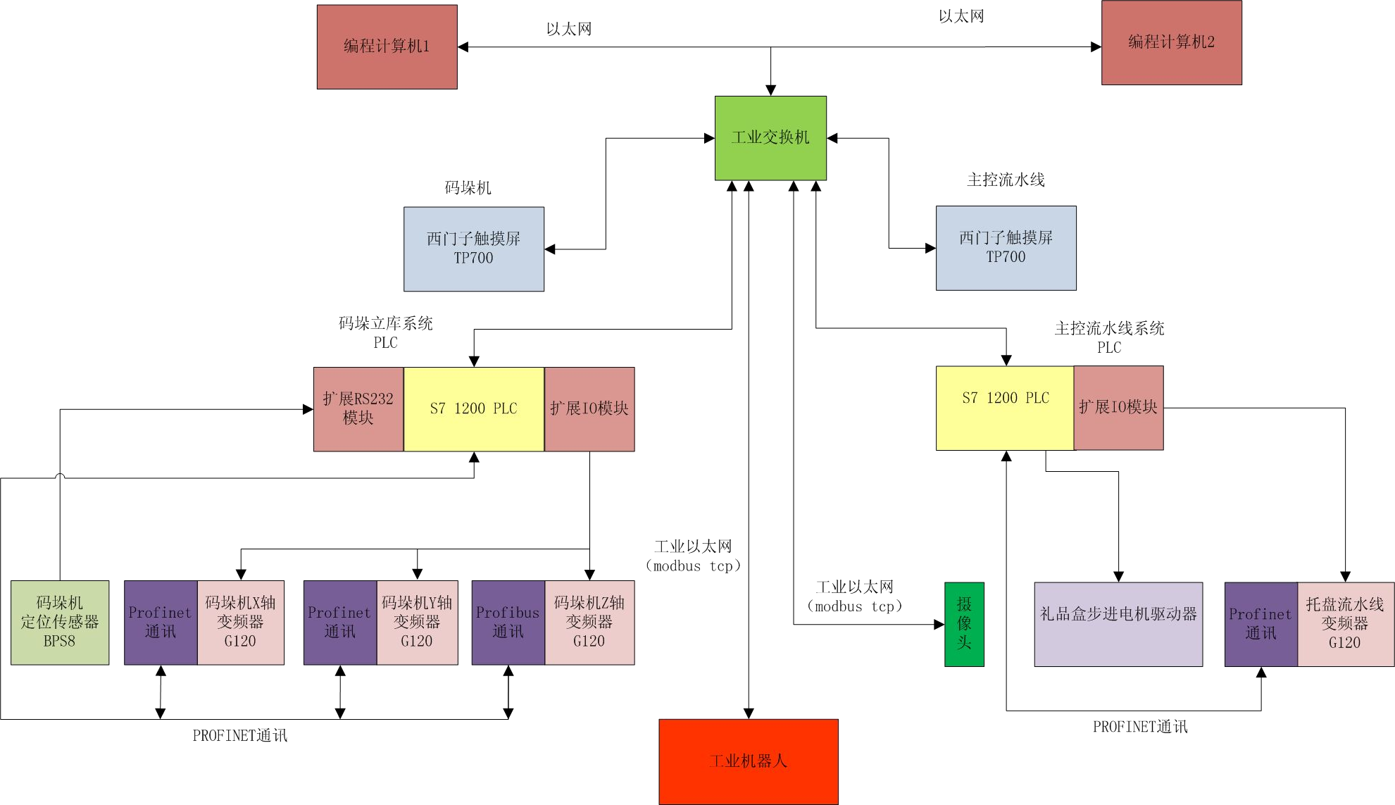 如上圖所示,整個(gè)系統(tǒng)通過工業(yè)以太網(wǎng)總線,把工業(yè)機(jī)器人、主控流水線 PLC、碼垛機(jī)立庫系統(tǒng) PLC、碼垛機(jī)立庫系統(tǒng)觸摸屏、主控流水線觸摸屏、視覺系統(tǒng)、變頻器以及編程開發(fā)計(jì)算機(jī)等均通過以太網(wǎng)連接。編程開發(fā)計(jì)算機(jī)負(fù)責(zé)開發(fā)調(diào)試程序、視覺系統(tǒng)特征識(shí)別開發(fā)以及機(jī)器人示教等編程。碼垛立庫系統(tǒng)和主控流水線觸摸屏負(fù)責(zé)管理碼垛立庫系統(tǒng)、主控流水線的運(yùn)行參數(shù),以及系統(tǒng)報(bào)警和提示信息等。