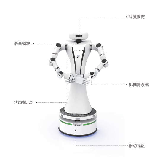 一.機(jī)器人整體組成:不少于1個主控模塊、不少于1個移動底盤、不少于2條七軸機(jī)械臂、不少于1個末端執(zhí)行器、不少于1個深度視覺傳感器;