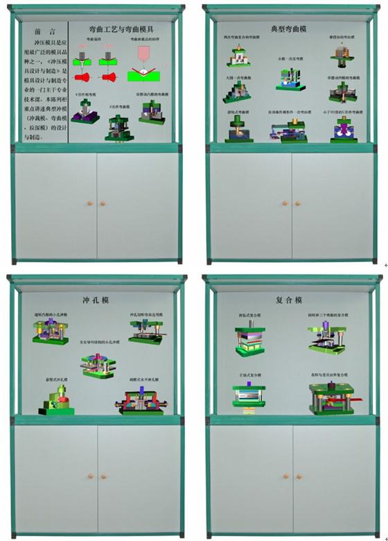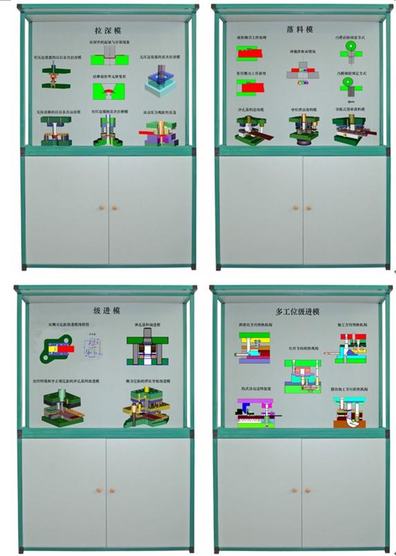 CLG-N04型 多媒體智能控制《沖壓模具設(shè)計(jì)與制造》陳列柜是模具設(shè)計(jì)與制造專業(yè)的一門主干專業(yè)技術(shù)課。適用于《沖壓模具設(shè)計(jì)與制造》、《沖模設(shè)計(jì)應(yīng)用實(shí)例》等課程。本課程是以教育部高教司《關(guān)于加強(qiáng)高職高專人才培養(yǎng)工作的若干意見》等文件對(duì)高職高專人才培養(yǎng)的要求為指導(dǎo)思想。采用多種素材和媒體手段,講述典型沖模(沖裁模、彎曲模、拉深模)的設(shè)計(jì)與制造,適度介紹了多工位級(jí)進(jìn)模設(shè)計(jì)與制造。陳列柜共分八個(gè)柜和一個(gè)電腦控制臺(tái),進(jìn)行多媒體聲控同步解說(shuō)演示。柜內(nèi)47件模型均采用動(dòng)畫圖像由PC電腦軟件控制順序或任選播放演示沖壓模具功能原理。
