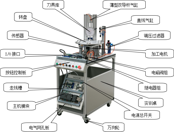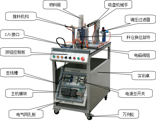 該系統(tǒng)上使用了大量的氣動(dòng)元件,包括多種電控氣動(dòng)閥、多種氣動(dòng)缸、氣動(dòng)夾爪、真空吸盤、真空發(fā)生器、過(guò)濾減速閥等。在學(xué)習(xí)這些氣動(dòng)元件時(shí),不但可以單獨(dú)學(xué)習(xí)每一種分離元件,而且還可以在學(xué)習(xí)時(shí)了解各種氣動(dòng)元件之間,以及氣動(dòng)元件與其它元件之間,如何配合起來(lái)并協(xié)調(diào)進(jìn)行工作的。