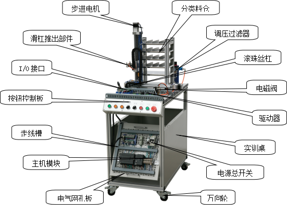 由滾珠絲杠、滑桿推出部件、分類料倉(cāng)、步進(jìn)電機(jī)、步進(jìn)驅(qū)動(dòng)器、電感傳感器、開(kāi)關(guān)電源、可編程序控制器、按鈕、I/O接口板、通訊接口板、電氣網(wǎng)孔板、多種類型電磁閥及氣缸組成,主要完成按工件類型分類,將工件推入料倉(cāng)。
