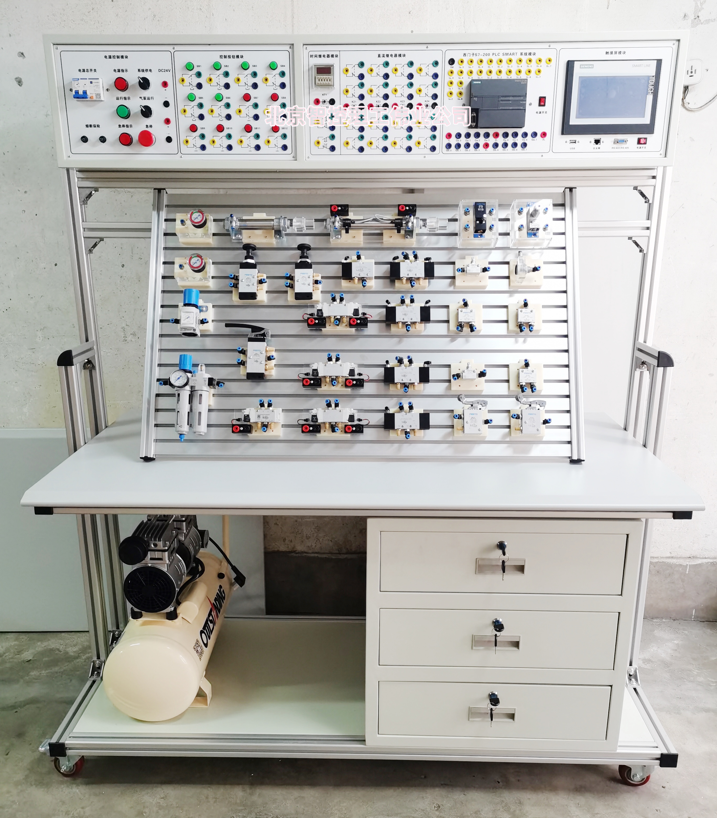 1、系統(tǒng)采用電、氣一體化結(jié)構(gòu),下半部分為標(biāo)準(zhǔn)化氣動(dòng)實(shí)訓(xùn)板,用以完成氣動(dòng)元件的安裝固定、氣路及電路的連接;上半部分為自動(dòng)化控制箱,用以完成PLC、低壓電器等的安裝和接線(xiàn)。