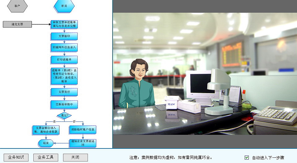 學(xué)生在經(jīng)過基礎(chǔ)的實務(wù)課程學(xué)習(xí)后,將被置于一個完全仿真的現(xiàn)代商業(yè)銀行的工作環(huán)境中,面對銀行每日的工作開始進(jìn)行模擬實操。學(xué)生們將會面對虛擬的客戶提出的各種要求來進(jìn)行相應(yīng)的處理。對于學(xué)生來講,實操過程中的所有操作都是自由的,他們需要通過完全自主的思考來判斷下一步的操作。譬如客戶提出的支票轉(zhuǎn)帳請求是否受理?如果不受理理由是什么?(譬如涉及支票的鑒別、簽章的鑒別等)接受以后如何操作?同時模擬系統(tǒng)根據(jù)內(nèi)置的業(yè)務(wù)邏輯自動判斷學(xué)生操作的正確性,對其業(yè)務(wù)能力進(jìn)行實時的評價和記錄,并且將結(jié)果及時反饋給學(xué)生。通過每一步操作的自主思考和系統(tǒng)不斷的提示加強(qiáng)學(xué)生對于業(yè)務(wù)處理的理解,幫助其提高業(yè)務(wù)操作的熟練程度,并且培養(yǎng)其判斷分析能力。實操訓(xùn)練的內(nèi)容完全參照日常銀行業(yè)務(wù)操作所涉及的范圍,同時也可以根據(jù)實驗課程主題的要求進(jìn)行具體的靈活配置。