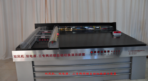 該雙風(fēng)機(jī)、雙電源、自動切換,三專二閉鎖演示裝置(適合于一、二、三、四級),通過聲光機(jī)械控制技術(shù),顯示出了井下局部通風(fēng)機(jī)雙風(fēng)機(jī)、雙電源、自動切換、三專二閉鎖系統(tǒng)的布置,運行方式。