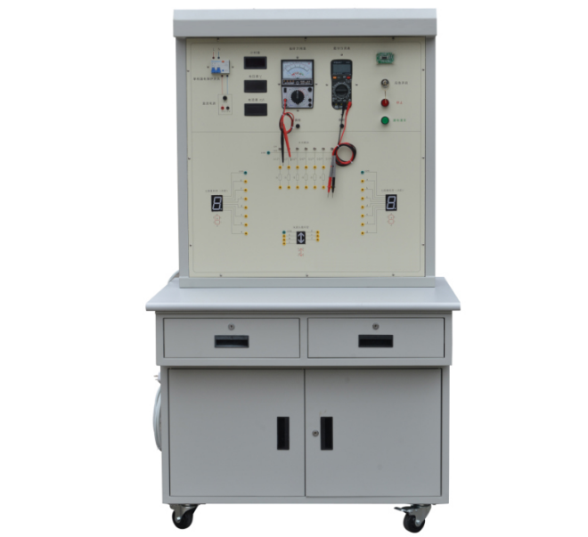 (1)實訓(xùn)臺主體部分采用全鋼結(jié)構(gòu),鋼板亞光噴塑,美觀耐用,臺面采用鋁塑板印制而成,整個實訓(xùn)臺由漏電保護開關(guān)、熔斷器、開關(guān)電源、數(shù)顯計時器、智能刷卡啟動電路板、七段數(shù)碼管(共陰)、七段數(shù)碼管(共陽)、方向數(shù)碼管、交流接觸器、數(shù)字電壓表、數(shù)字電流表、指針萬用表、數(shù)字萬用表、照明日光燈、帶鎖開關(guān)、按鈕開關(guān)、鈕子開關(guān)、電阻器和安全接線柱等組成。