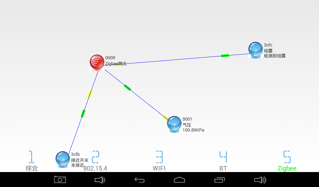 網(wǎng)關(guān)應(yīng)用軟件通過CoAP服務(wù)和串口服務(wù),將WiFi、藍牙、IEEE802.15.4、以及ZigBee感控節(jié)點數(shù)據(jù)解析處理,在網(wǎng)關(guān)的Mesh拓?fù)鋱D中實時流動地顯示傳感器數(shù)據(jù)的上、下行走向;