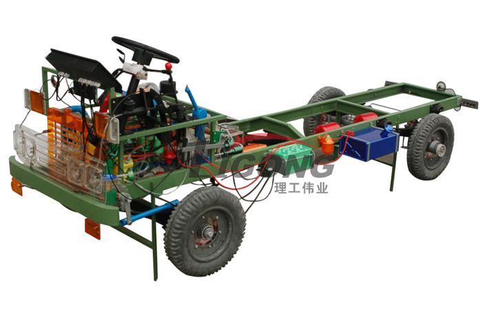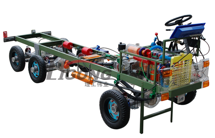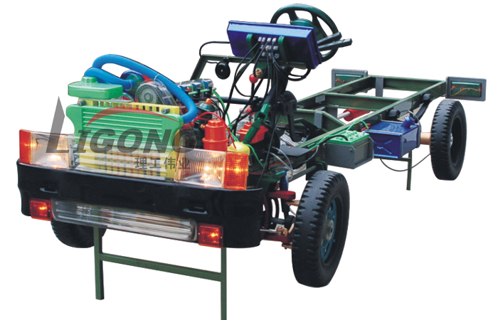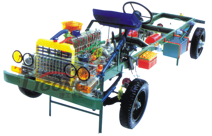 本品選用透明有機(jī)玻璃制作,內(nèi)中部件均以硬質(zhì)塑料料加工,用 螺絲固定在金屬高溫烘漆而成的車架上。各總成部分都以壓模成形加 工,代替過去膠粘合的方法,使產(chǎn)品在強(qiáng)度上有很大提高。發(fā)動(dòng)機(jī)總成用電機(jī)驅(qū)動(dòng),在油門處設(shè)有調(diào)速裝置,能演示發(fā)動(dòng)機(jī)轉(zhuǎn)速高低。離合器分離明顯,操縱靈活,離合器外殼整體壓模而成,變速箱和各檔齒輪用各種顏色表示,換檔靈活,手制動(dòng)美觀。后橋外形壓模而成,內(nèi)中主減速、差速轉(zhuǎn)動(dòng)自如,輪轂剎蹄壓模成型,剎蹄可調(diào)節(jié),前橋輪鼓可調(diào)整,轉(zhuǎn)向裝置以及電瓶、油箱、水箱,制動(dòng)管路分布清楚一目了然。電路采用對插件前后分布,燈架、風(fēng)窗、儀表板、后燈架用透明有機(jī)玻璃壓模成整體美觀逼真。