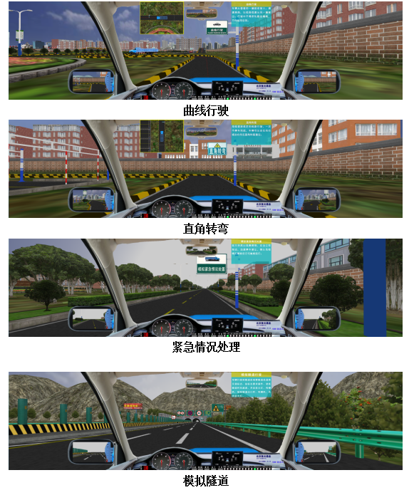 | 道路場景 | 炫目道路:(朝九晚五的太陽)炫目會車,炫目駕駛鄉(xiāng)村道路等。泥濘道路:泥濘洼地道路駕駛(方向、制動、驅動有打滑滯后感)場景模型取鄉(xiāng)村道路,道路變?yōu)槟酀魻顟B(tài)。石子路面:汽車在其上面行駛,遇到剎車時剎不住車,還可汽車還在繼續(xù)滑動,有時還會斜向滑行,極難控制感,汽車在石子路面里滑動。涉水道路:涉水駕駛汽車有水流沖力對車輛的前進阻力感光及側滑感,輪胎與水下的路壓力減小,驅動力受到限制,使行駛受阻感覺。專項訓練:要附合交通部要求。系統(tǒng)評分:每次駕駛結束,系統(tǒng)自動評分。山區(qū)到路:突出坡多、彎多、凹凸路面、駕駛環(huán)境復雜、有側風、有陡坡長坡、溜坡、側滑(有語音提示)。鄉(xiāng)村道路:含鐵道路口;加油站,公交車站、單行道、農田道口等;城市道路:含公交站臺,高架立交橋、公交專用道、十字路口、丁字路口、環(huán)島、隧道、單行道、雙黃線、加油站、商場百貨門口斑馬線天橋,學校門口及紅綠燈,行人、非機動車亂穿馬路及非機動車等。高速公路:包括收費站(入、停、出、)服務區(qū)、緊急帶、匝道行駛、超車道、行車道、隧道、立交橋、交通標牌標線。危險場景:視線不清的交通情況下,超車后突然切入他人道引起被超車輛緊急制動、自行車、行人突然橫穿馬路,路面維修,障礙物繞行等 危險場景、 | |