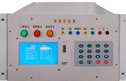 網(wǎng)側(cè)控制器面板安裝有三個信號指示燈,16鍵PVC軟鍵盤,240*128點蘭色液晶屏及7個波形測試端子。信號指示燈可對控制器工作、故障、卸荷狀態(tài)分別給于指示,通過鍵盤可完成并網(wǎng)啟動/停止設(shè)置。液晶屏可完成三相電流,電壓有效值顯示,直流母線電壓顯示;面板觀測孔可觀測電網(wǎng)相電流波形、相電壓波形及直流母線電壓波形。