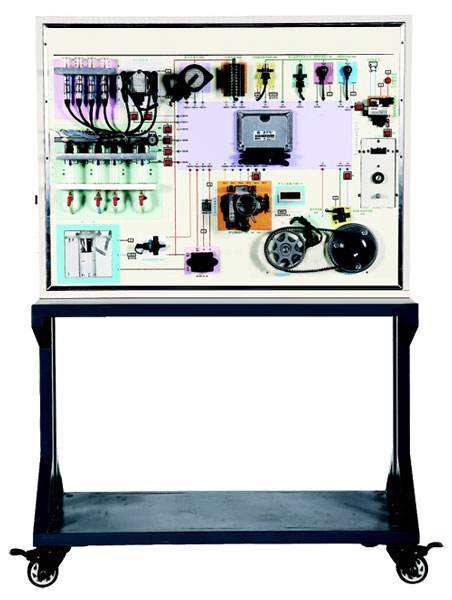 汽車汽油發(fā)動(dòng)機(jī)電控系統(tǒng)示教板完整展示了上海大眾桑塔納2000AJR型閉路電子控制多點(diǎn)燃油噴射式發(fā)動(dòng)機(jī)的電控系統(tǒng),設(shè)備包括發(fā)動(dòng)機(jī)電控單元、空氣流量計(jì)、進(jìn)氣溫度傳感器、節(jié)氣門組件、發(fā)動(dòng)機(jī)轉(zhuǎn)速傳感器、霍爾傳感器、冷卻液溫度傳感器、氧傳感器、爆震傳感器、噴油器、點(diǎn)火線圈、燃油泵等真實(shí)汽車部件,能動(dòng)態(tài)演示電控發(fā)動(dòng)機(jī)燃油噴射、電子點(diǎn)火及調(diào)整過程,面板上設(shè)有相關(guān)測試點(diǎn)和故障設(shè)置開關(guān),便于教師利用儀器儀表對其測試和故障現(xiàn)象模擬。