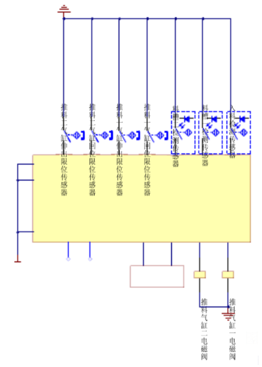 系統(tǒng)啟動,將物料放到光電傳感器前的皮帶上,當光電傳感器檢測到有工件進入,即給控制系統(tǒng)發(fā)出信號,控制系統(tǒng)給變頻器發(fā)出啟動信號。變頻器驅(qū)動三相交流電機帶動皮帶轉(zhuǎn)動,當物料為金屬時電感傳感器檢測到信號,變頻器停止,推料氣缸一動作,將物料推入第一個料槽;當物料為非金屬時電容傳感器檢測到信號,變頻器停止,推料氣缸二動作,將物料推入第二個料槽。