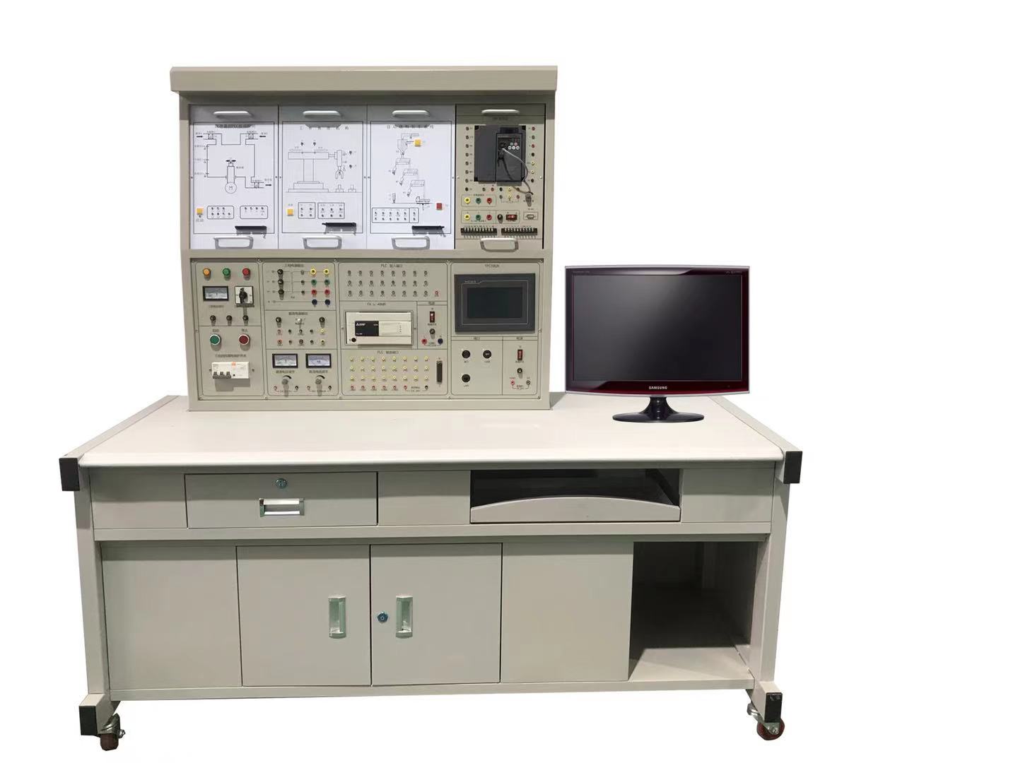 PLC可編程控制器實(shí)驗(yàn)裝置由控制屏、實(shí)訓(xùn)桌、PLC主機(jī)實(shí)訓(xùn)組件、PLC實(shí)訓(xùn)模塊、變頻器掛箱、觸摸屏掛箱、交直流電機(jī)、總線單元、通信模塊、電機(jī)導(dǎo)軌、測(cè)速機(jī)構(gòu)等組成。