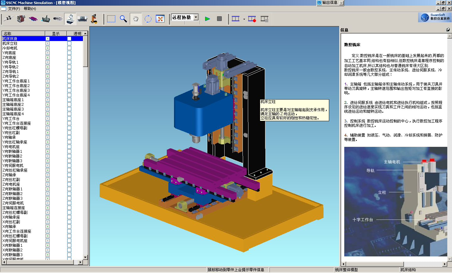 (2) 軟件具有數(shù)控車床和銑床的機械結(jié)構(gòu)展示(要求做到每一個機械部件)的3D顯示。銑床包括整機結(jié)構(gòu)、主軸箱總成、伺服總成、絲桿連接總成、Z軸總成等。