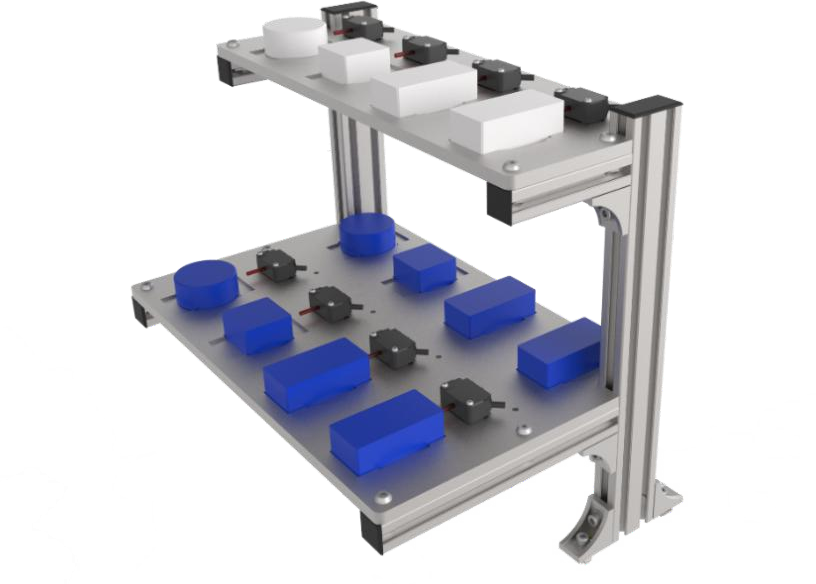 智能料庫(kù)分為上下兩層,每層設(shè)置 4 個(gè)工位。每個(gè)工位都可以放置正方形、長(zhǎng)方形或圓形的物料。同時(shí),每個(gè)工位安裝有傳感檢測(cè)裝置,可自行判斷此工位是否有物料。