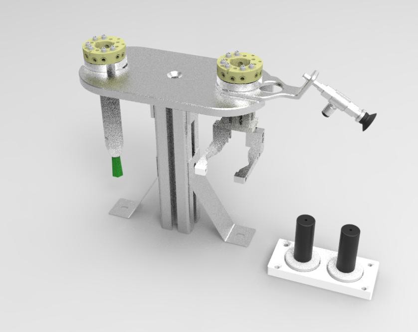 6、機(jī)器人工具模塊機(jī)器人末端工具是機(jī)器人的執(zhí)行單元,如圖 8 所示此模塊包括尖點(diǎn)輔助工具、筆工具、氣動(dòng)夾爪工具和氣動(dòng)吸盤工具。尖點(diǎn)輔助工具形狀為圓錐,具有TCP 校準(zhǔn)功能,同時(shí)可以模擬去毛刺、涂膠工具。筆工具、夾爪工具和吸盤工具都配備了機(jī)械快換工具,與機(jī)器人法蘭盤的機(jī)械快換工具配套使用,可實(shí)現(xiàn)工具的快速更換。筆工具內(nèi)部設(shè)置有緩沖裝置,可以有效減少學(xué)生初步學(xué)習(xí)機(jī)器人操作時(shí),由于不熟練導(dǎo)致剛性碰撞產(chǎn)生對(duì)工具的損壞。筆工具可以完成軌跡、寫字和繪畫等實(shí)驗(yàn)內(nèi)容,彩筆可快速更換。夾爪工具和吸盤工具采用國(guó)際知名品牌, 用于物料的抓取和吸附。
