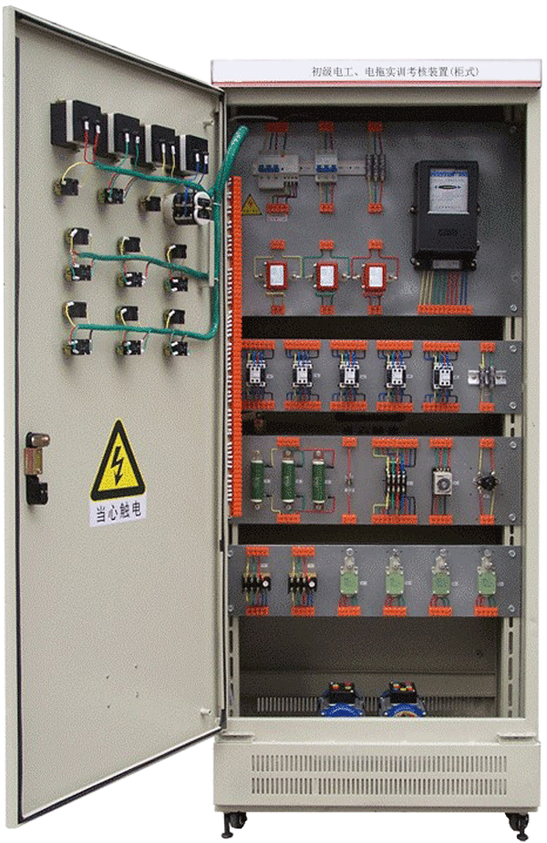 一、概述 電工實訓考核裝置是中職在電工培訓教學中而設計,完成培養(yǎng)學生在實踐中的基本技能和接線技巧,電工實訓考核柜,它包括了照明電路、電力拖動控制電路等...