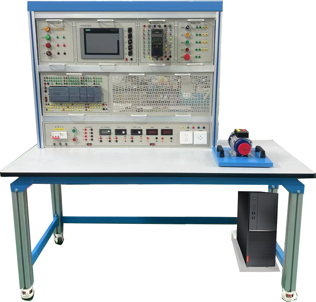 PLC實驗裝置由控制屏、實訓(xùn)桌、主機實訓(xùn)組件、實訓(xùn)模塊(含豐富的工業(yè)現(xiàn)場設(shè)備模擬實訓(xùn)對象)、變頻器掛箱、觸摸屏掛箱、交直流電機、總線單元、通信模塊、電機導(dǎo)軌、測速機構(gòu)等組成。