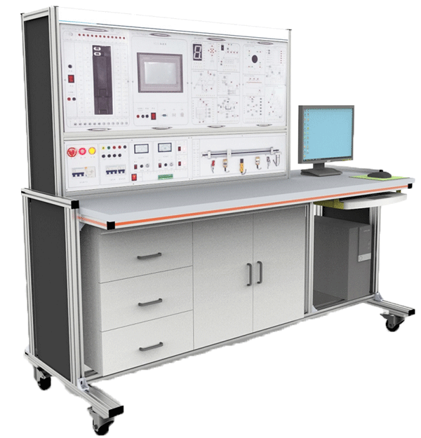 2、臺架構(gòu)成:實訓(xùn)臺采用工業(yè)鋁型材加工。桌面下面放置儲物柜,左側(cè)有3層抽屜,用于存放工具以及實訓(xùn)資料,右側(cè)為雙拉門式設(shè)計,可以放置實訓(xùn)掛箱。底部裝有四個帶鎖止功能的萬向輪。柜體后下側(cè)留有電源輸入線。預(yù)留計算機放置位置。