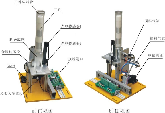 | 8 | 供料機構(gòu) | 主要由井式工件庫、推料氣缸、物料臺、光電傳感器、磁性開關(guān)、電磁閥、支架、機械零部件構(gòu)成。 | 1套 | ![]() |