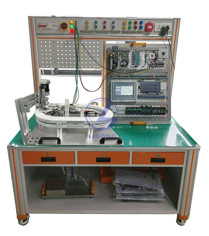 LG-JD02A型 機電一體化實訓工作站采用“模塊化”的設計理念,標準化電路接口、氣路接口和機械接口??傮w由工作臺、電氣控制掛板、環(huán)形輸送分揀應用模塊等構成。 工作站包含實訓平臺、控制掛板、應用模塊、電腦桌組成,實訓平臺采用優(yōu)質(zhì)鋁型材做骨架,鋁型材立柱與實訓桌面連接。左右兩側(cè)及后面封裝優(yōu)質(zhì)鋼板,正面設計儲物柜與抽屜。