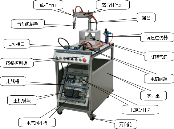 該系統(tǒng)上使用了大量的氣動(dòng)元件,包括多種電控氣動(dòng)閥、多種氣動(dòng)缸、氣動(dòng)夾爪、真空吸盤、真空發(fā)生器、過(guò)濾減速閥等。在學(xué)習(xí)這些氣動(dòng)元件時(shí),不但可以單獨(dú)學(xué)習(xí)每一種分離元件,而且還可以在學(xué)習(xí)時(shí)了解各種氣動(dòng)元件之間,以及氣動(dòng)元件與其它元件之間,如何配合起來(lái)并協(xié)調(diào)進(jìn)行工作的。