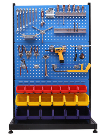 工具架采用3層掛板工具架,立柱采用2.0mm優(yōu)質(zhì)矩形管,掛板采用1.5mm冷軋鋼板制作;掛板為藍(lán)色,立柱和底板為黑色,配置鋁合金手柄,方便移動,能夠完成工具的有序掛置與存放,充分利用空間,整潔高效率,環(huán)保無毒。配置專用掛鉤,整體尺寸為:960*375*1450mm(長寬高)。