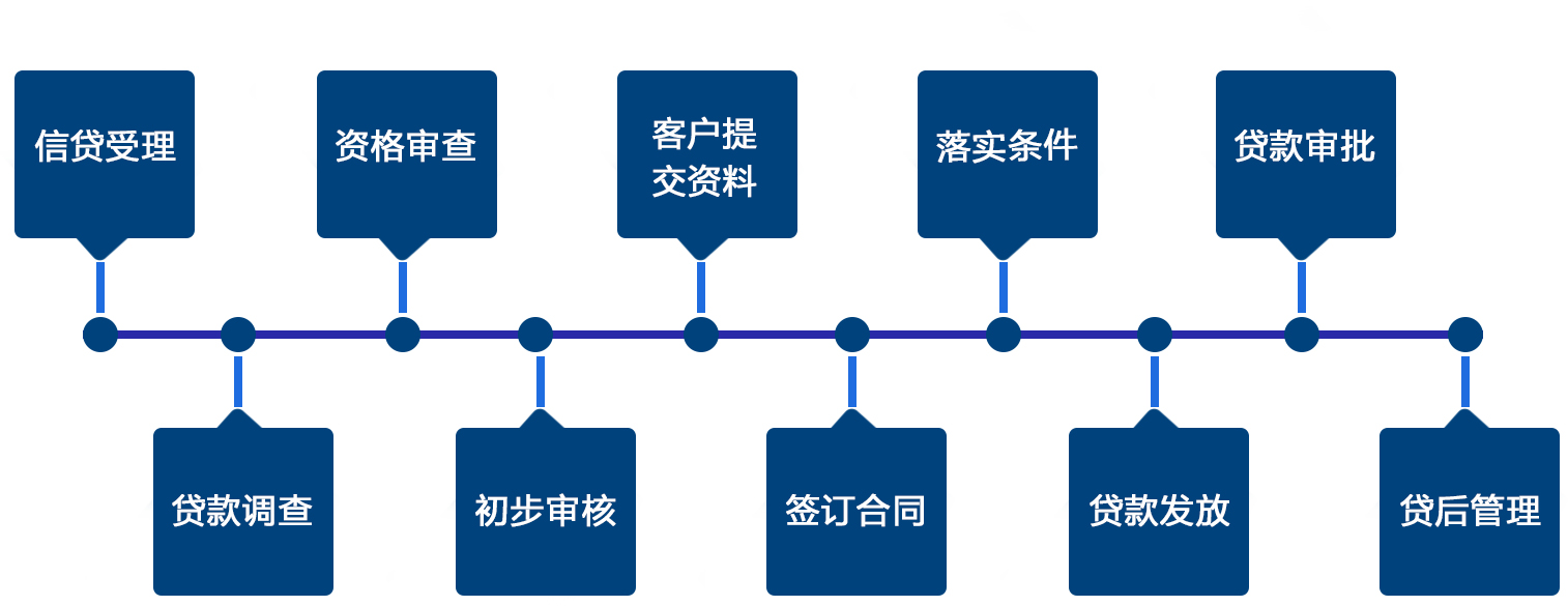 實(shí)訓(xùn)主體分五類流程:短期貸款、長(zhǎng)期貸款、票據(jù)貼現(xiàn)、個(gè)人住房抵押貸款、個(gè)人汽車消費(fèi)貸款。提供靈活的業(yè)務(wù)流程控制,包括受理、資格審查、貸款調(diào)查、貸款審批、落實(shí)條件、簽訂合同、貸款發(fā)放、貸后管理等步驟。