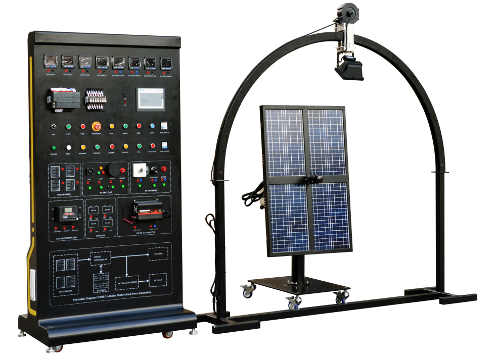 傳統(tǒng)的太陽(yáng)能發(fā)電技術(shù)主要為太陽(yáng)能電池板以固定的角度安放在地面上,這樣使太陽(yáng)能電池板的轉(zhuǎn)換效率大大的降低。而我們根據(jù)太陽(yáng)運(yùn)動(dòng)軌跡應(yīng)用PLC控制系統(tǒng)、光學(xué)傳感器和直流電機(jī)系統(tǒng)實(shí)現(xiàn)了太陽(yáng)能電池板的追日。使太陽(yáng)能電池板始終與太陽(yáng)入射光線成90°夾角,實(shí)現(xiàn)太陽(yáng)能電池板的效率最大化。為了使學(xué)生能充分的學(xué)習(xí)新技術(shù)、了解當(dāng)前新能源科技的發(fā)展前沿。我公司結(jié)合當(dāng)前太陽(yáng)能發(fā)展情況和未來(lái)的發(fā)展方向研制出了新型的太陽(yáng)能發(fā)電設(shè)備:太陽(yáng)能光伏發(fā)電綜合實(shí)訓(xùn)系統(tǒng)。