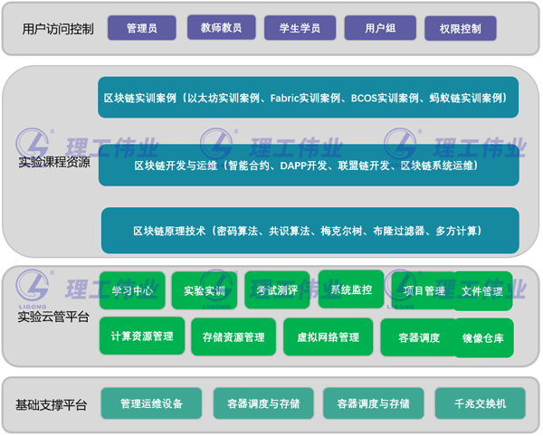 區(qū)塊鏈實(shí)驗(yàn)教學(xué)平臺(tái)的的產(chǎn)品設(shè)計(jì)由下而上分為四層,即:基礎(chǔ)支撐平臺(tái)、實(shí)驗(yàn)云管平臺(tái)、實(shí)驗(yàn)課程資源、用戶訪問(wèn)控制。